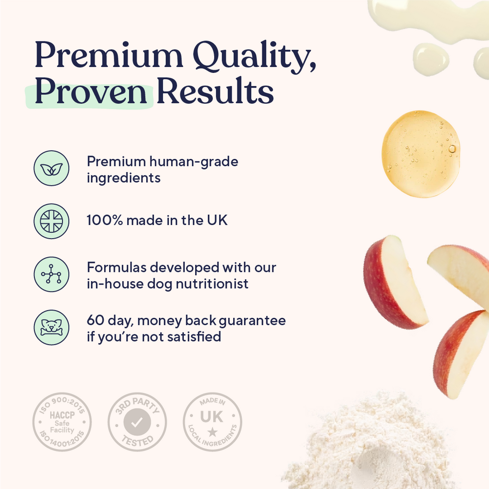 Apple pectin and probiotics work together to support digestive health and maintain a balanced gut. This may help your dog better manage allergy symptoms and improve overall digestion, contributing to their comfort and well-being.