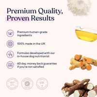 Our Multivitamin chews are packed with essential vitamins like A, B, C, and D, plus omega-3-rich salmon oil to support strong joints, heart health, and a shiny coat. With anti-inflammatory ingredients like turmeric, these chews help keep your dog active, healthy, and full of energy. An easy, tasty, daily boost to fill any gaps in their diet.