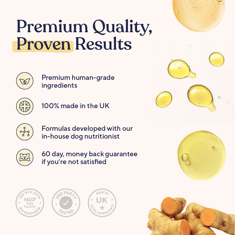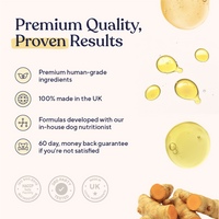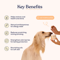 Salmon and primrose oils start nourishing your dog’s skin from the inside, helping to hydrate and support a healthier coat. You may notice reduced dryness and a shinier, softer coat.